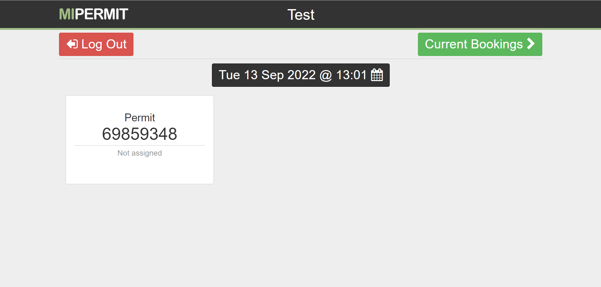 In this example, the overview and booking screen shows an allocated permit to vehicle T123EST, expiring 13.58 13/9/2022.