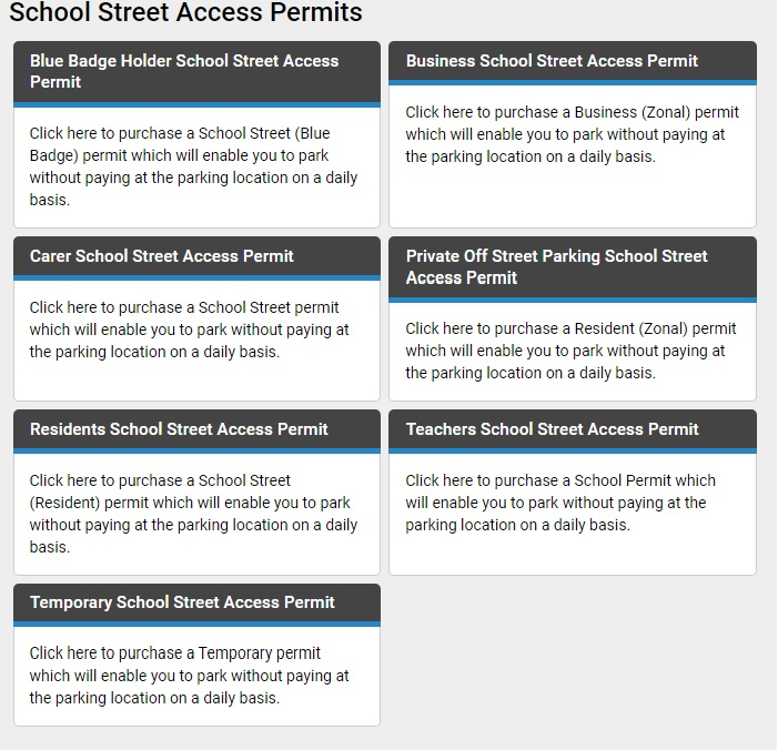 Once you have selected a permit category (such as Resident School Street Access Permit), select the Permit Type (the list of School Street Zones may differ depending on your address and you may only see what is available for your post code):